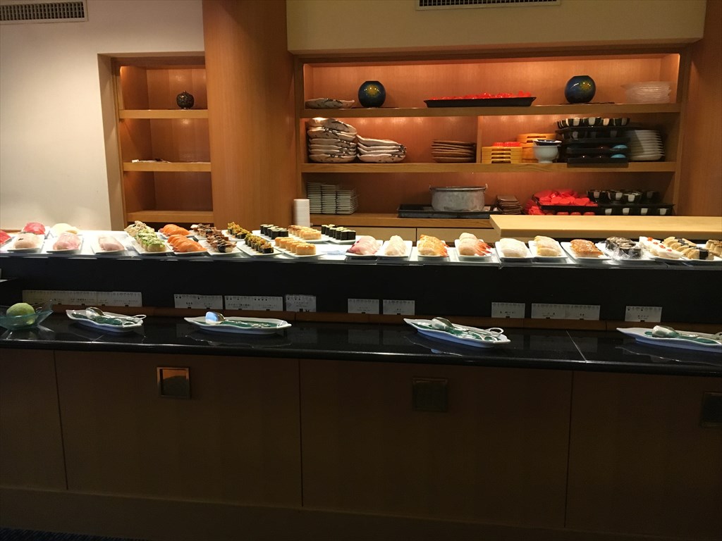 カウンターにずらりと並べられたお寿司。天ぷら、汁物、サラダ、デザートなどもありました。カウンターに並べられている料理以外にも、巻物や軍艦などはテーブルでオーダーできました。