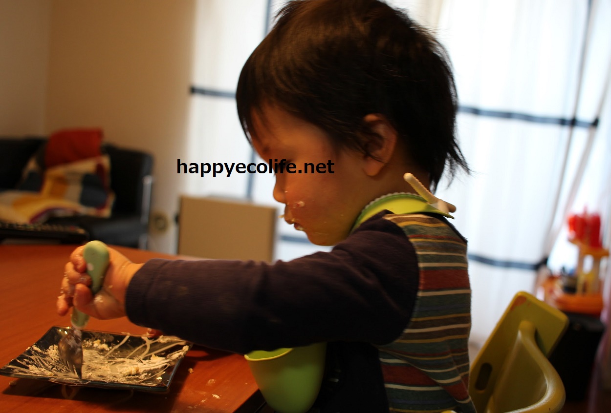 2歳児、ワンカットきれいに完食。まだまだ手づかみ食べも多い時期ですが、ケーキはフォークで食べることを覚えたようです。